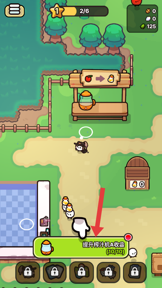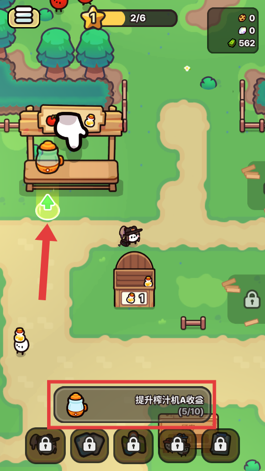 2、进入游戏场景,查看右上角资源数量,按提示移动至箭头所指处,进行【提升榨汁机A收盆-(5/10)】操作。