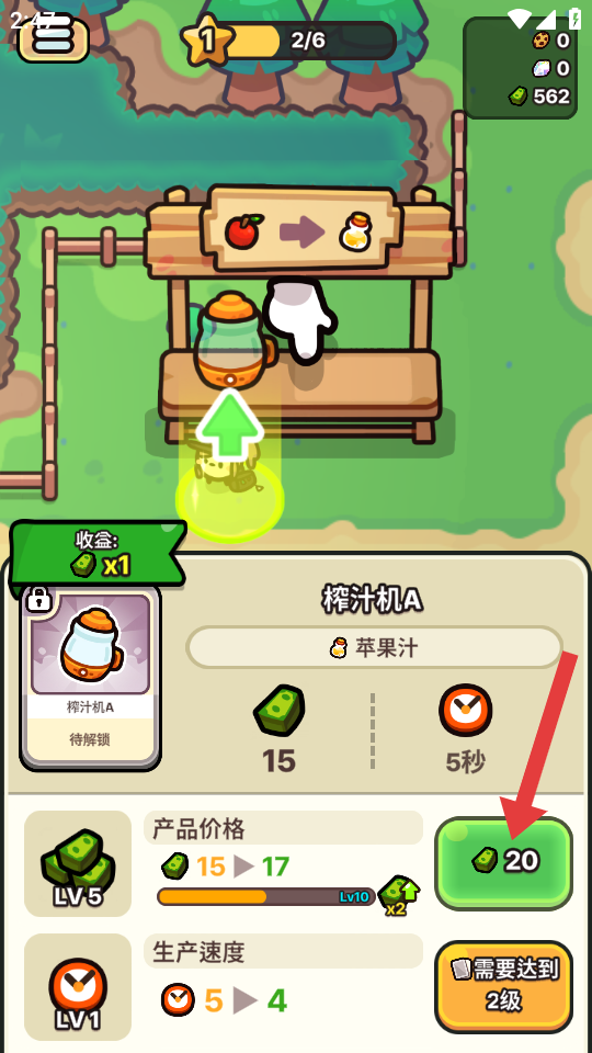 3、点击榨汁机,在弹出界面中,消耗资源点击如箭头所指的【20】按钮,提升【榨汁机A】的【产品价格】。