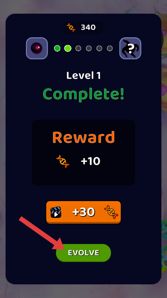2、当【DNA】数量达标,看到【Level-1-Complete!】提示后,点击【EVOLVE】按钮进行进化。
