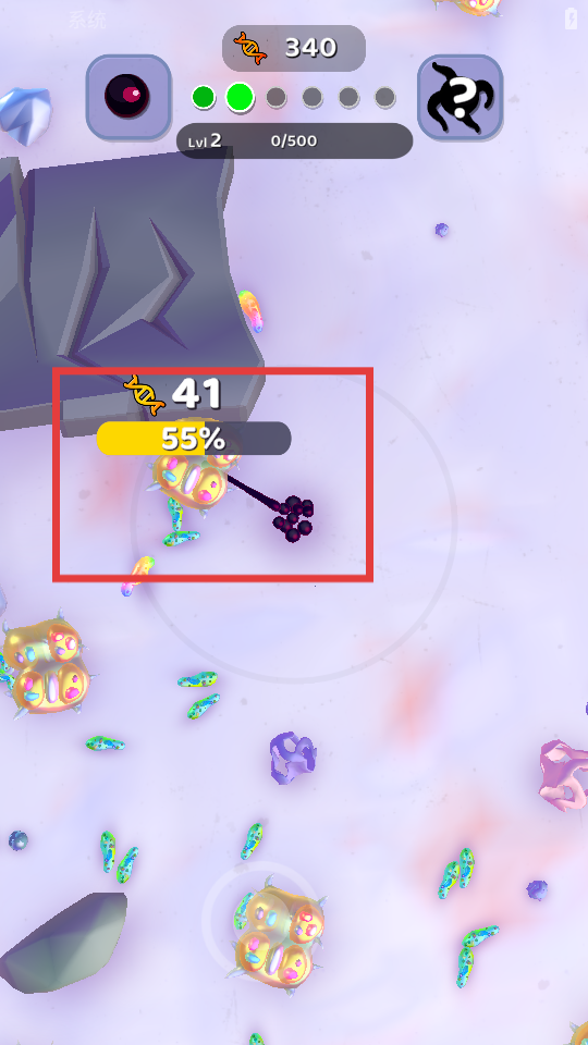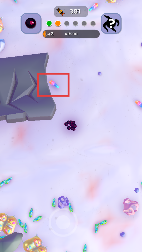 4、当遇到方框内的【彩色细胞】时,移动过去将会直接吞噬增加DNA能量。