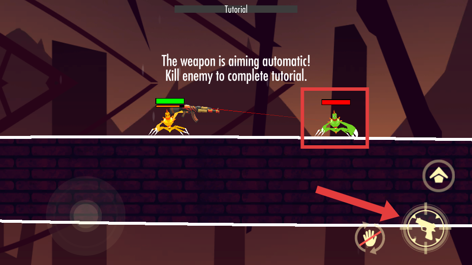 3、获取武器后,面对红框内的【绿色螃蟹敌人】,点击【射击】按钮,自动瞄准并击杀敌人。