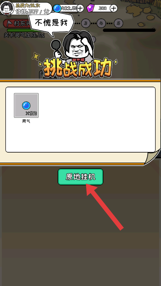 3、成功战胜敌人,出现【挑战成功】提示后,点击【原地挂机】按钮,持续获取【灵气】收益。