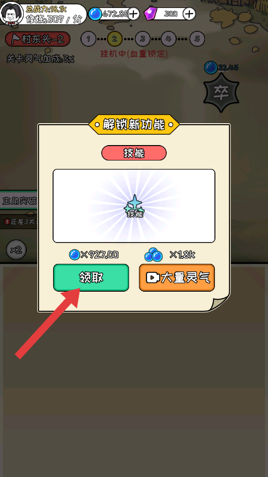 4、挂机积累一定资源后,若解锁新功能,点击【领取】按钮,获取技能等新功能,提升角色实力。