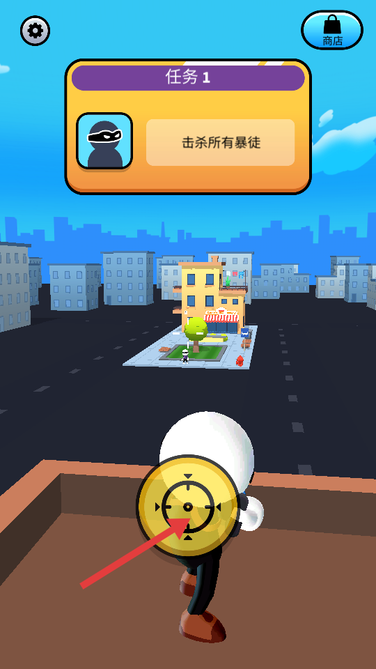 2、通过瞄准镜锁定地面的暴徒,调整准星,进行射击。
