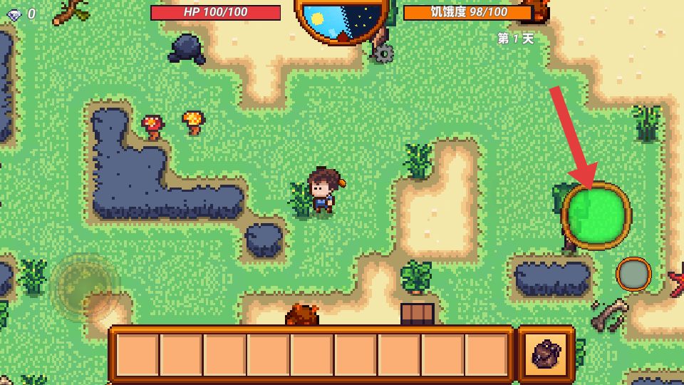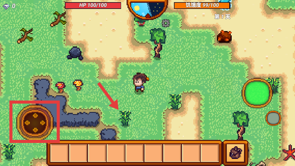 2、进入游戏后,通过红框内的【虚拟摇杆】控制角色移动,靠近如箭头所指的【植物】。