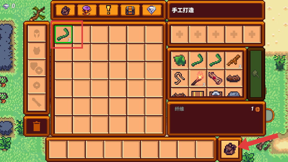 4、打开【背包】界面后,点击红框内采集到的资源,在【手工打造】区域合成所需道具,维持生存。