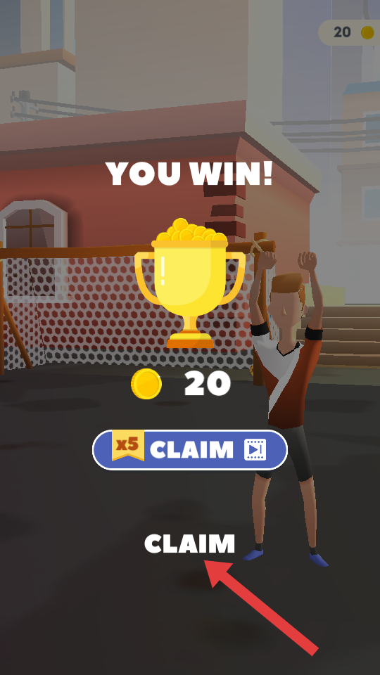 4、当显示【YOUWIN!】画面,点击【CLAIM】按钮,领取【20】金币等胜利奖励。