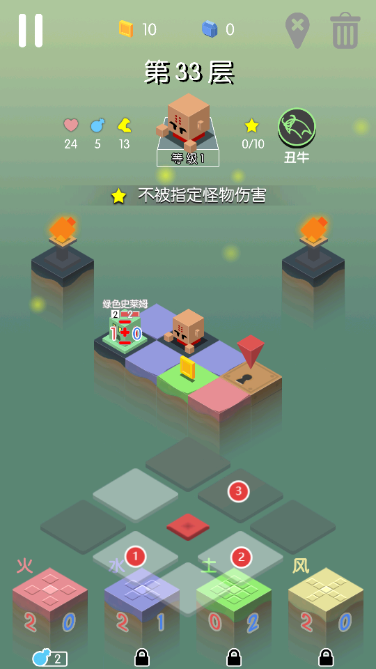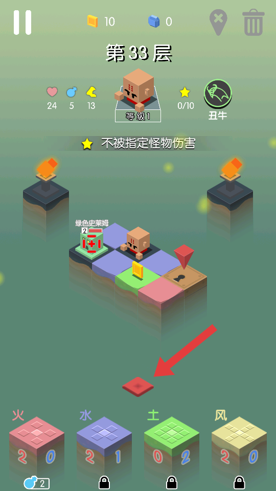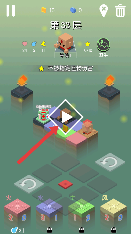 1、进入关卡后,明确任务目标为【不被指定怪物伤害】,点击箭头所指的方块准备操作。