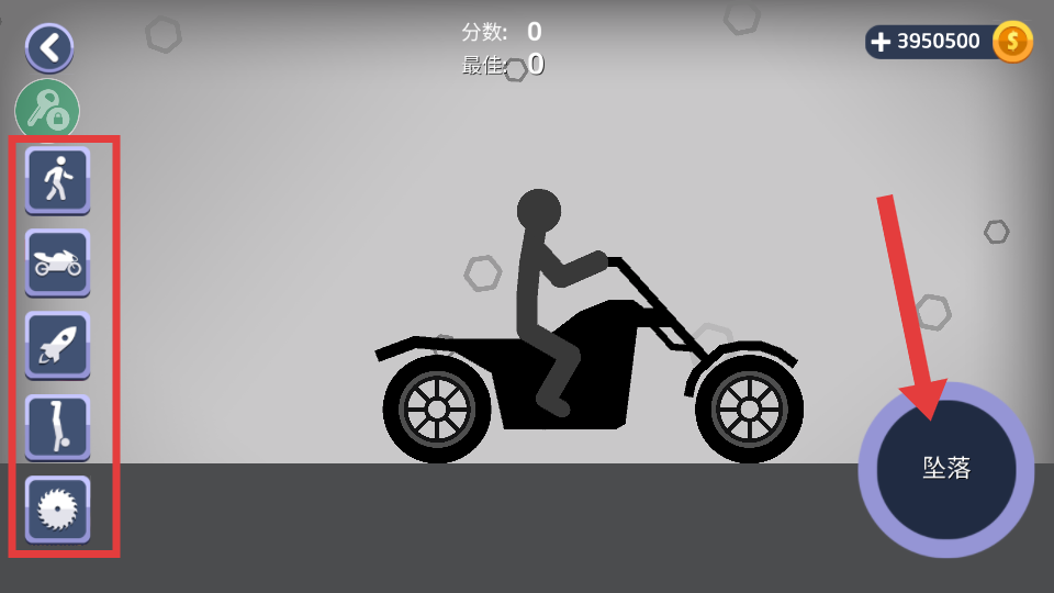 1、进入游戏界面,利用左侧红框内的图标选择火柴人的行动方式,选择【摩托车】载具后,长按【坠落】进行蓄力。