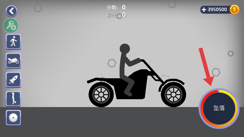 2、当【坠落】能量到达最大时,松开手即可让火柴人驾驶摩托车冲出。
