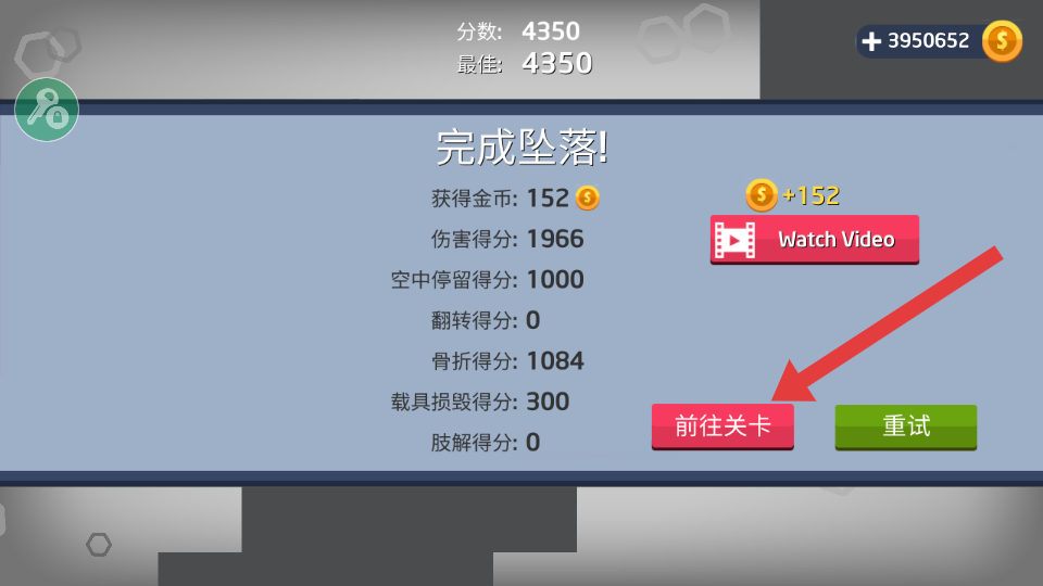 4、完成坠落挑战后,查看得分和获得金币情况,点击【前往关卡】按钮,进入下一关继续游戏。