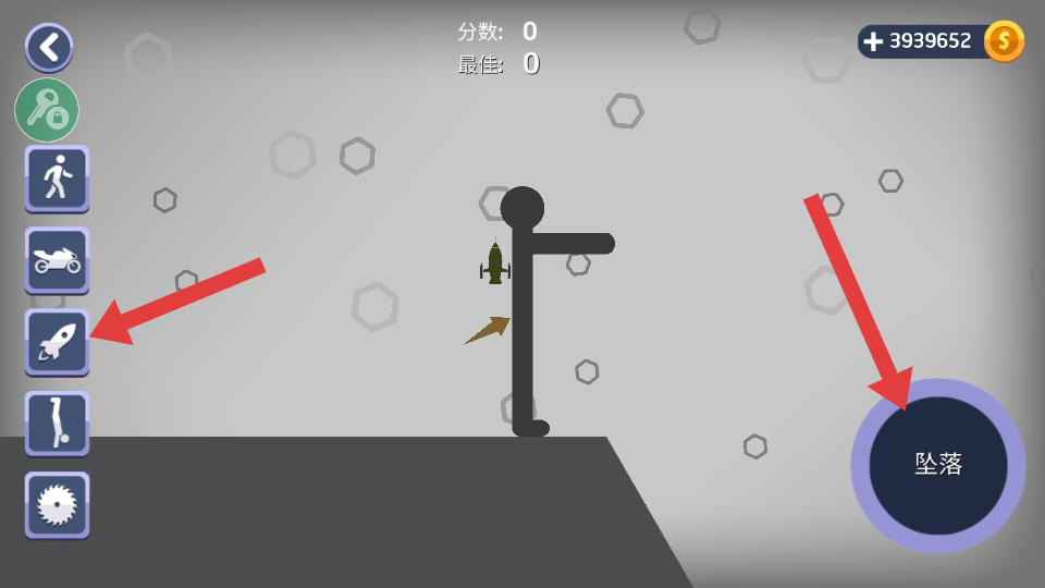 1、进入游戏界面后,点击左侧红框内的【火箭】图标,为火柴人选择坠落时的特殊道具,再长按【坠落】进行蓄力。