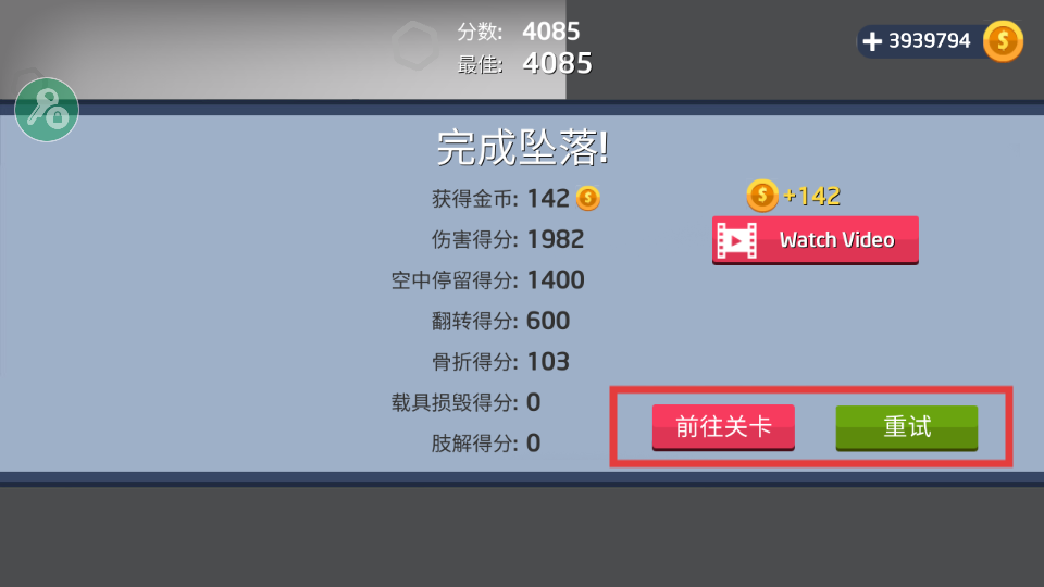 4、完成坠落挑战后,查看【获得金币】及各项得分情况,可点击【前往关卡】进入下一关,或点击【重试】再次挑战本关。