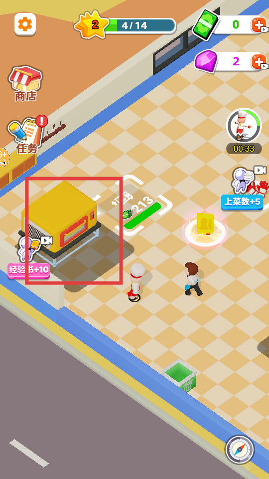 1、留意顾客头顶【披萨图标】的份数需求,如【2/3】【1/3】,【滑动屏幕】操控角色前往黄色烤箱进行制作披萨。