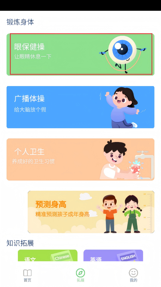 2、在拓展页面的“锻炼身体”板块,点击【眼保健操】,进入眼保健操步骤列表页面。