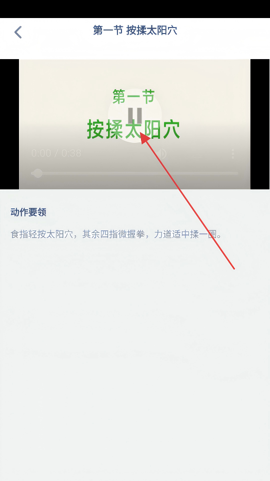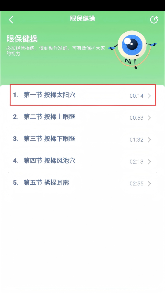 3、在眼保健操步骤列表里,选择【第一节按揉太阳穴】,进入该节的详细页面。