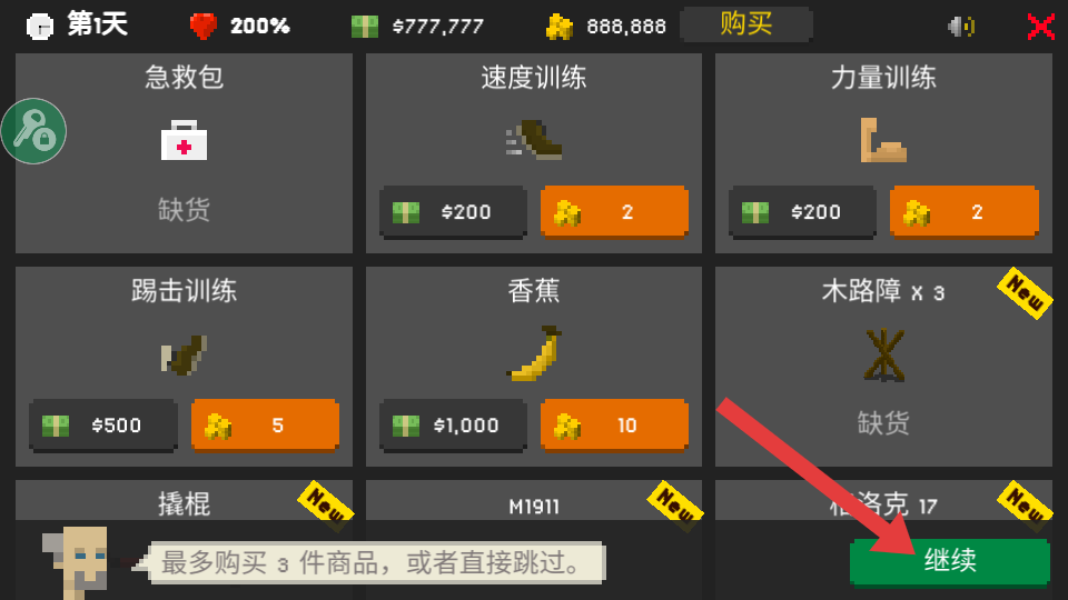 1、在商店界面,可根据需求购买【急救包】【速度训练】等道具,购买后点击【继续】按钮进入游戏。