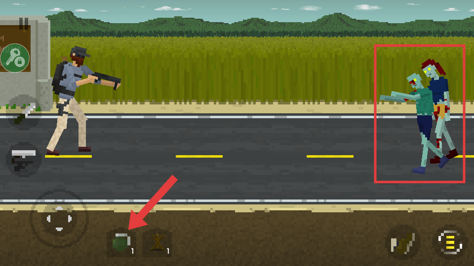 2、进入游戏场景后,遇到多只僵尸时,点击下方【手雷】进行使用。