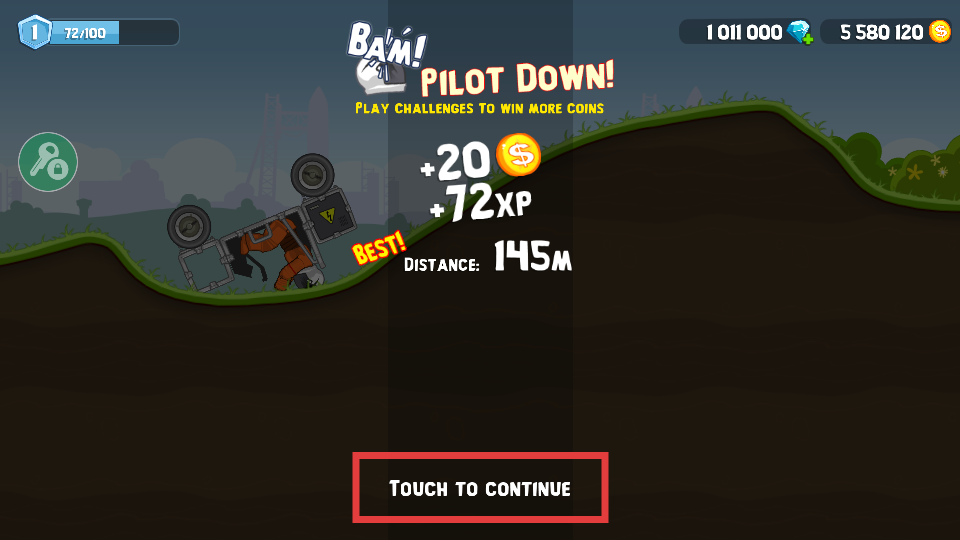 4、即便赛车翻车,点击【Touch-to-Continue】继续游戏,mod菜单助力快速恢复并挑战更远距离。