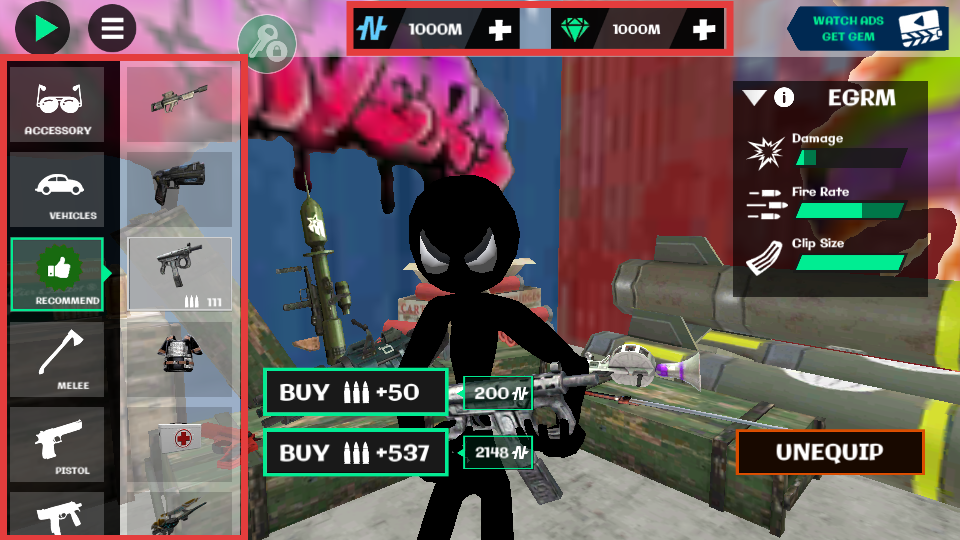 2、在商店中根据推荐选择武器,无限金币钻石让你可无限制购买弹药和装备,打造最强火柴人。