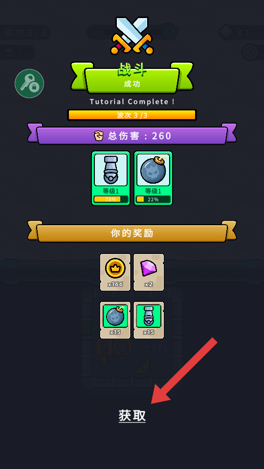 4、成功通过所有波次后,点击【获取】按钮领取金币、道具等奖励,用于后续关卡的炮台升级和道具购买。