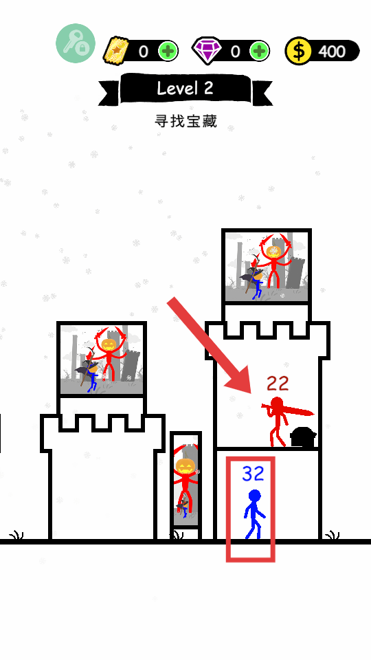 3、最后,将数值最大化的【蓝色小人】移动至数值为【22】的红色小人位置,将其击败获得胜利。