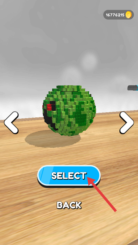 3、点击【SELECT】按钮,选择已解锁的绿色像素球体,为后续关卡使用。