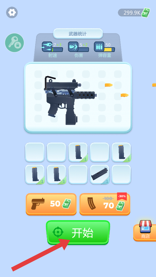 1、点击【开始】按钮进入游戏,可先查看武器统计的射速、伤害、弹容量,选择合适武器开启战斗。