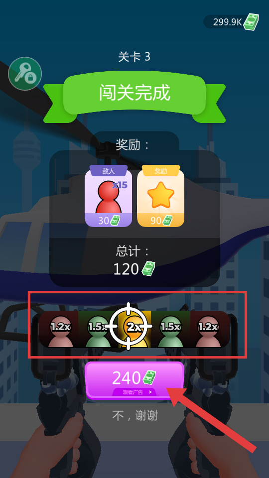4、闯关完成后,点击【240】跳过广告直接领取基础奖励,积累资金用于武器升级。
