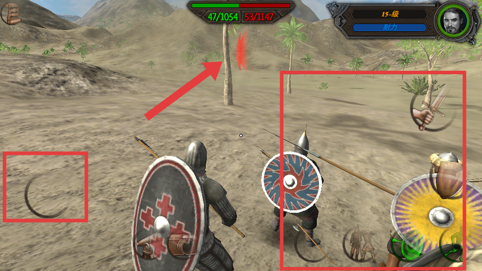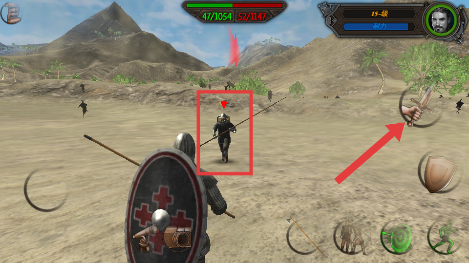 3、战斗中,用左侧虚拟摇杆移动,右侧武器图标攻击,凭借无限属性优势在沙漠等场景中征战。