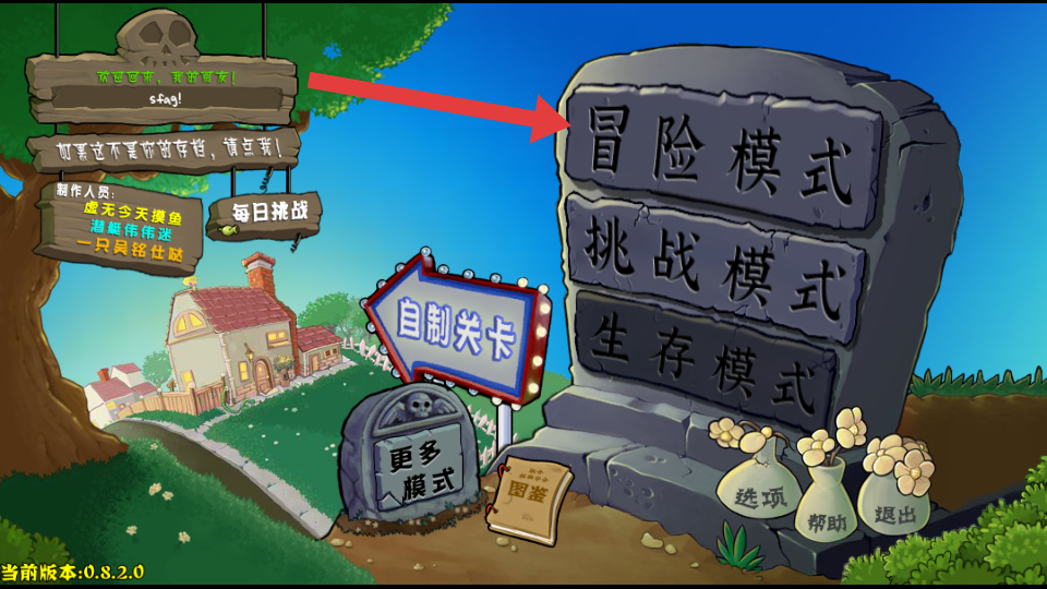 1、进入游戏后,选择【冒险模式】,开启植物大战僵尸的杂交重制冒险之旅。
