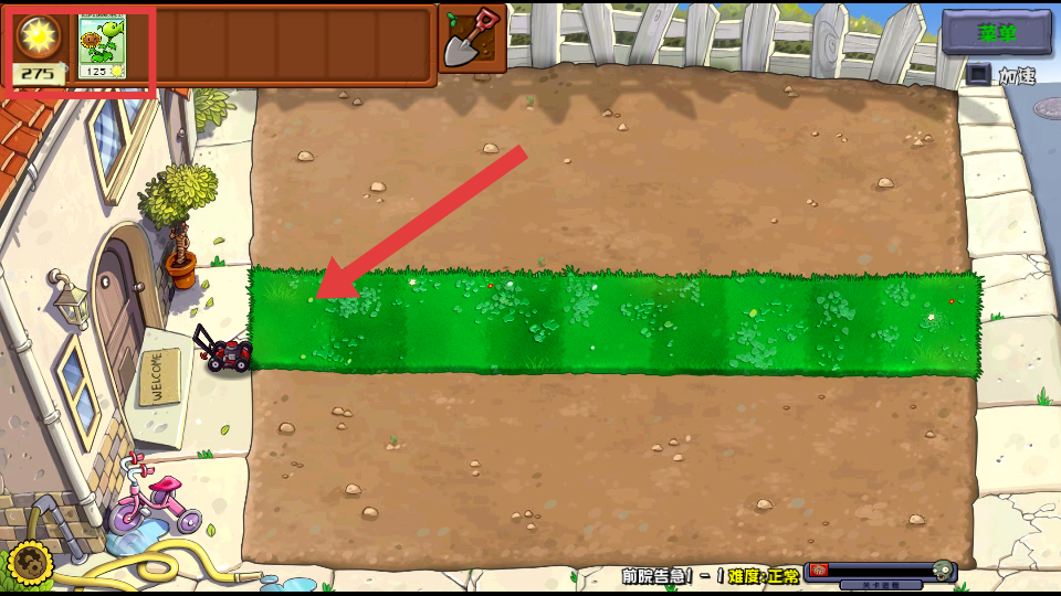 2、在游戏场景中,点击方框内【向日葵豌豆射手】放置箭头草坪上进行种植。