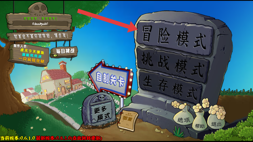 1、进入游戏后,选择【冒险模式】,开启植物大战僵尸杂交重制版0.6.1.0的冒险征程。