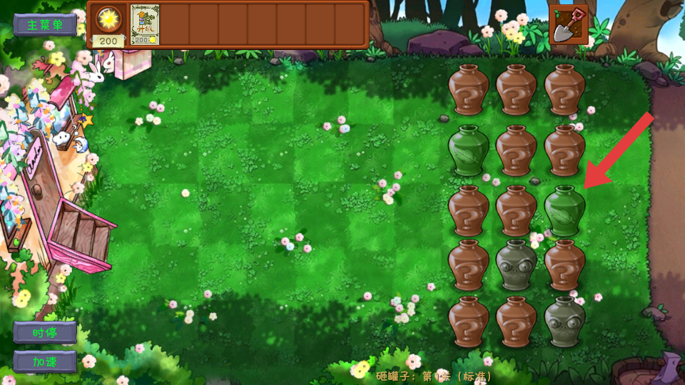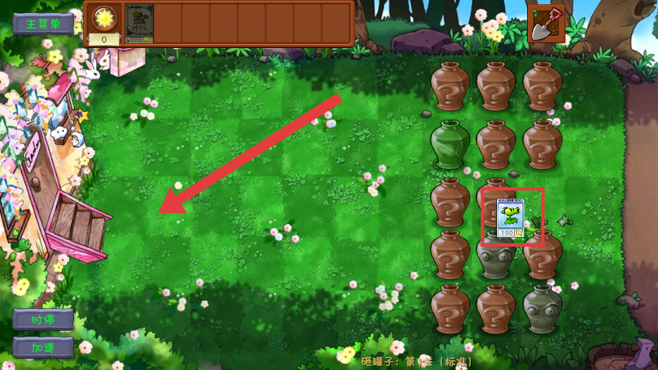 2、砸开罐子获取【植物卡片】后,利用内置菜单功能,将植物种植在合适位置,构建防御体系。