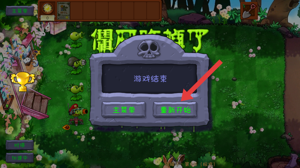 4、若游戏失败,通过内置菜单的【重新开始】选项,重新挑战关卡,利用菜单功能优化策略再战。