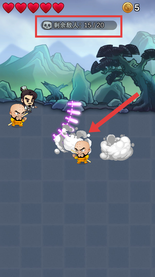 3、关注【剩余敌人】数量,利用内置菜单技能,如多剑攻击,快速消灭敌人,推进关卡。