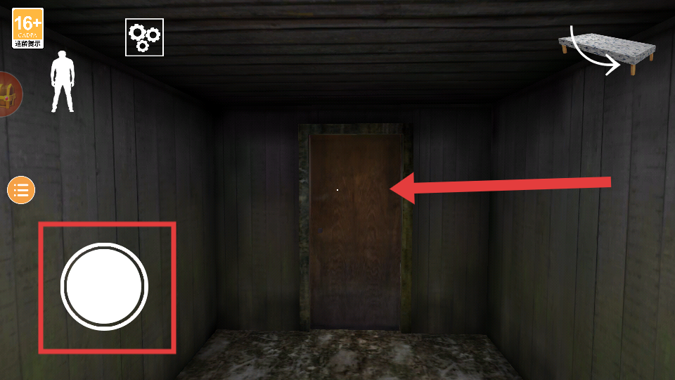 2、利用左侧圆形按钮操控角色移动,朝着木门方向前进,探索房间寻找逃生线索。