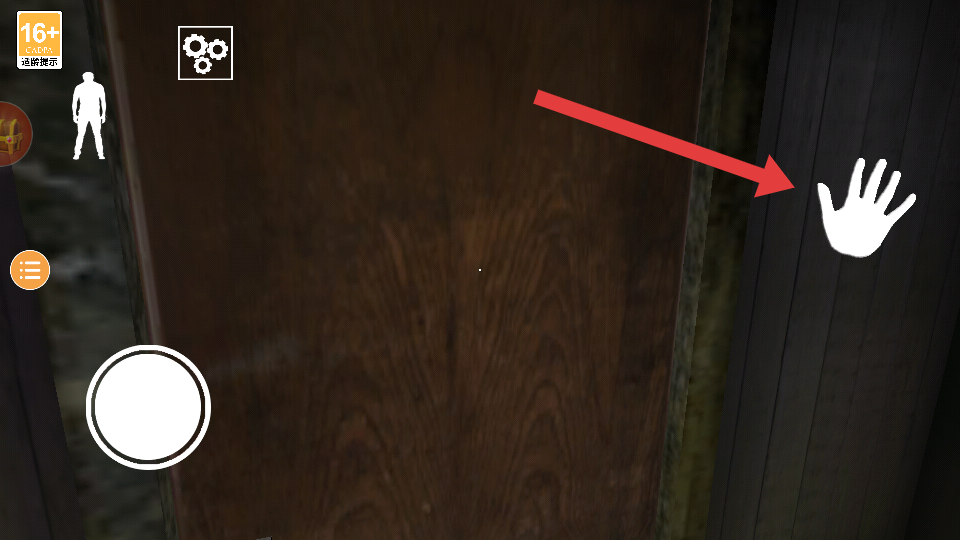 3、靠近木门时,点击右侧白色手掌图标,尝试打开木门,进入下一个区域继续探索。