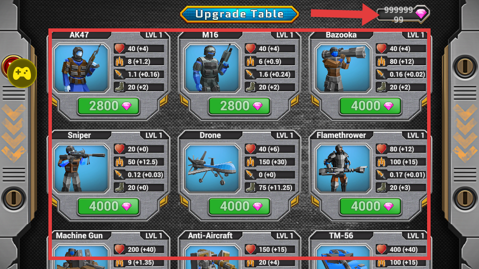 1、点击【UPGRADE】,进入升级界面,利用无限钻石升级兵种,提升战力。