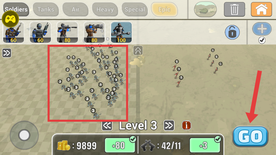 3、部署大量升级后的士兵到战场,点击【GO】,指挥士兵发起进攻,利用无限钻石带来的兵力优势压制敌方。