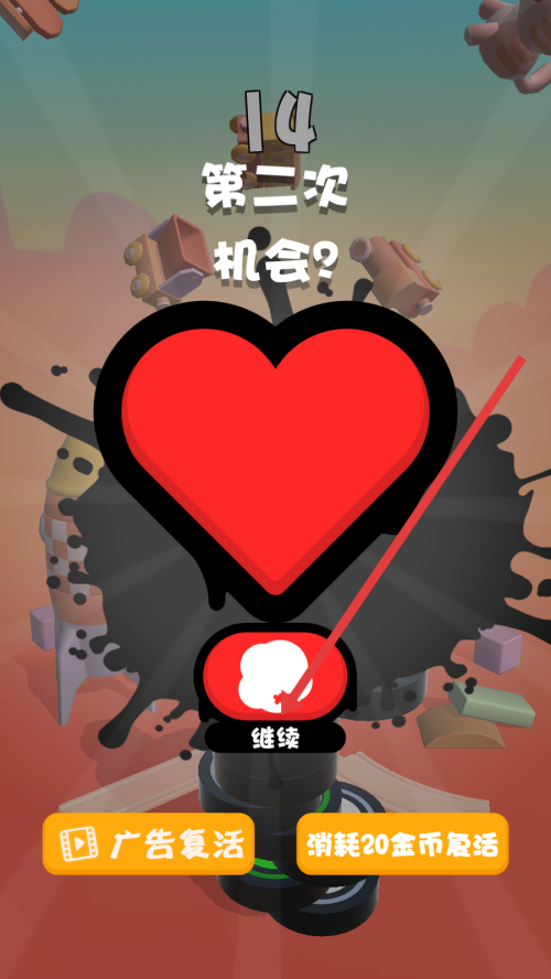 4、若游戏失败,出现【第二次机会?】提示,可选择【广告复活】或【消耗20金币复活】,继续游戏。