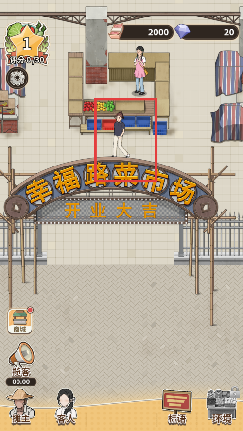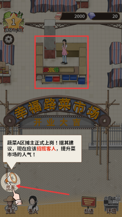 1、蔬菜A区摊主上岗后,点击【揽客】按钮,招揽客人,提升【幸福路菜市场】的人气,开启经营第一步。