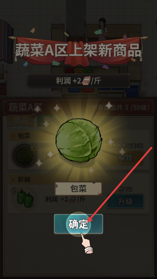 3、蔬菜A区上架新商品【包菜】,利润+2/斤,点击【确定】按钮,确认新商品上架,丰富摊位商品。