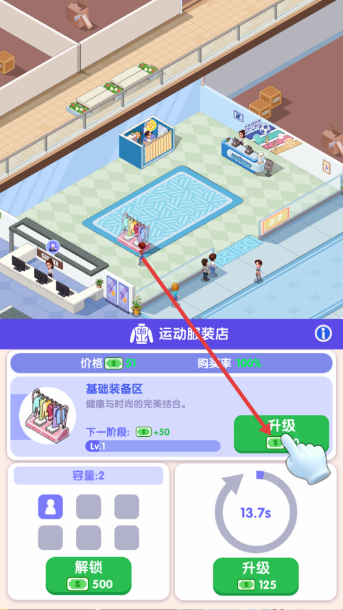3、进入运动服装店升级界面,点击【升级】按钮,消耗相应资源,提升运动服装店的等级。