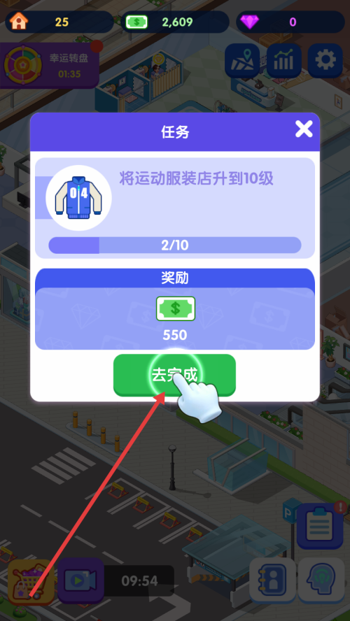 4、面对“将运动服装店升到10级”的任务,点击【去完成】按钮,着手完成任务,获取奖励。