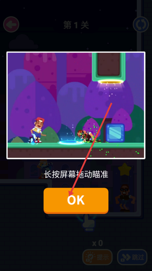 1、点击【OK】按钮,确认“长按屏幕拖动瞄准”的操作提示,进入第1关游戏。
