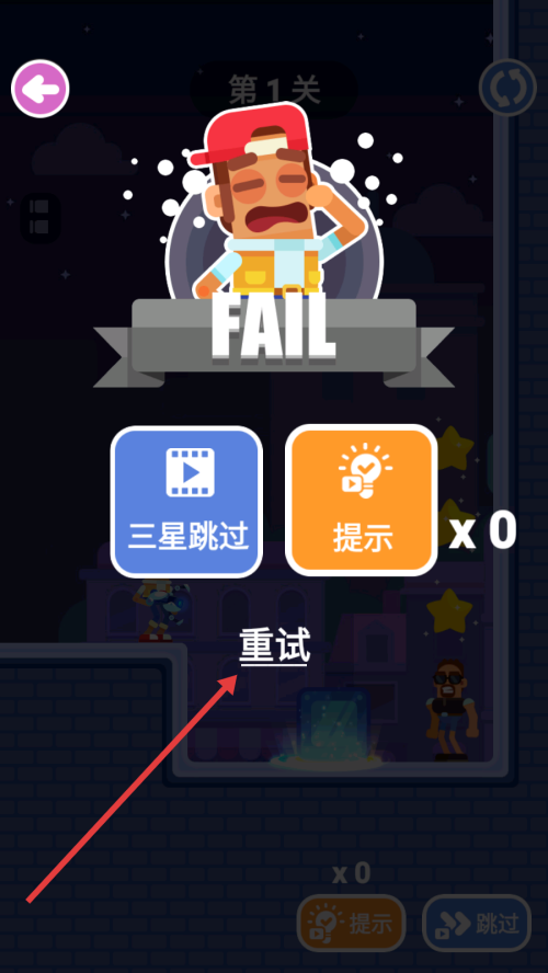 4、若游戏失败,点击【重试】按钮,重新开始关卡,总结经验,调整瞄准策略。