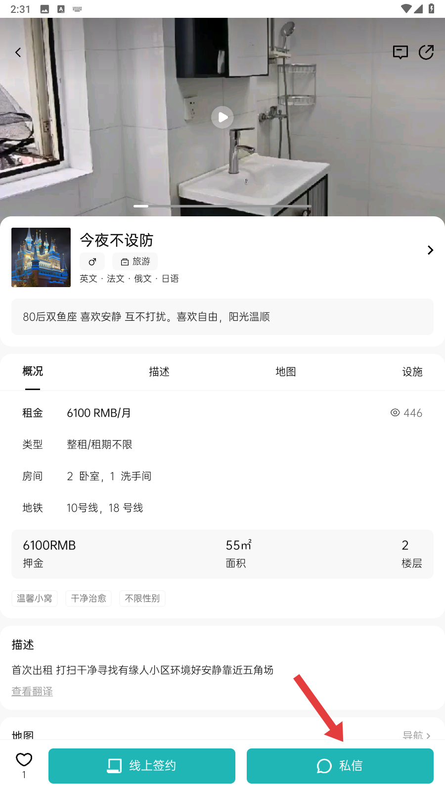 3、进入房源详情页后,若对房源满意,点击【私信】按钮,就可以和房主沟通租房事宜哦。