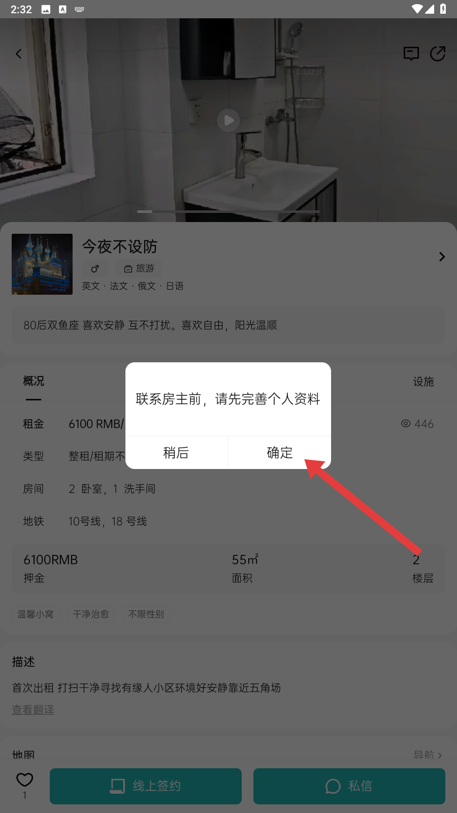 4、点击私信后,会提示完善个人资料,我们点击【确定】,按要求完善资料,就能顺利联系房主租房啦。