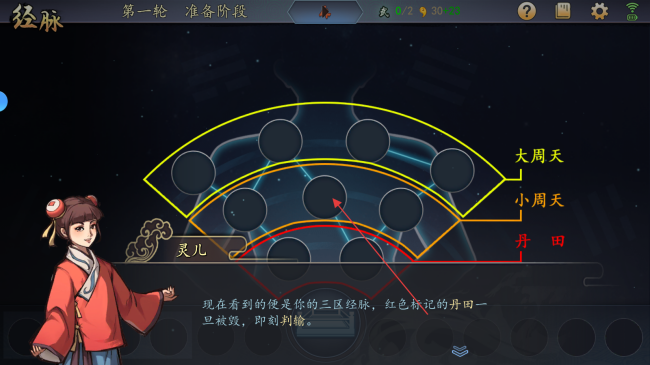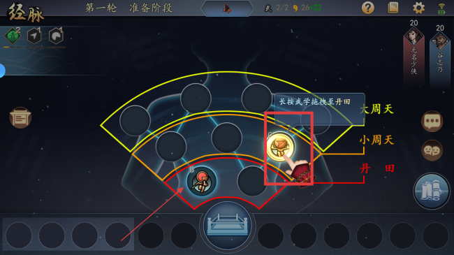 2、了解经脉系统,红色标记的丹田至关重要,一旦被摧毁就会立刻输掉,需重点保护。
